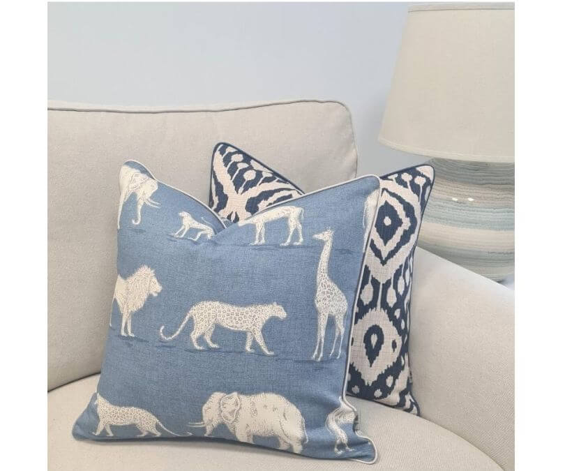 Granatowa dwustronna, kwadratowa poduszka dekoracyjna z motywem wpisującym się w malowniczy pejzaż sawanny. Lamówka dekoracyjna w kolorze granatowym.